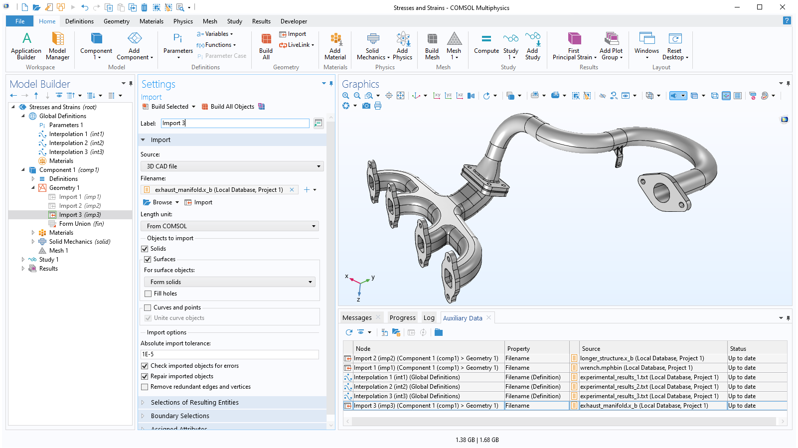 CAD파일이나 실험 데이터 파일과 같은 보조 데이터 파일을 쉽게 관리할 수 있습니다. Auxiliary Data 창에서 모델에 사용된 모든 보조 데이터의 개요를 볼 수 있으며, 모델에서 보조 데이터 파일이 사용된 위치를 빠르게 확인할 수 있습니다. 최근 버전에서 보조 데이터 파일을 사용할 수 있는 경우 자동으로 알림이 표시되고, 데이터베이스에서 가장 최신 파일을 사용할 것인지 묻는 메시지가 표시됩니다.