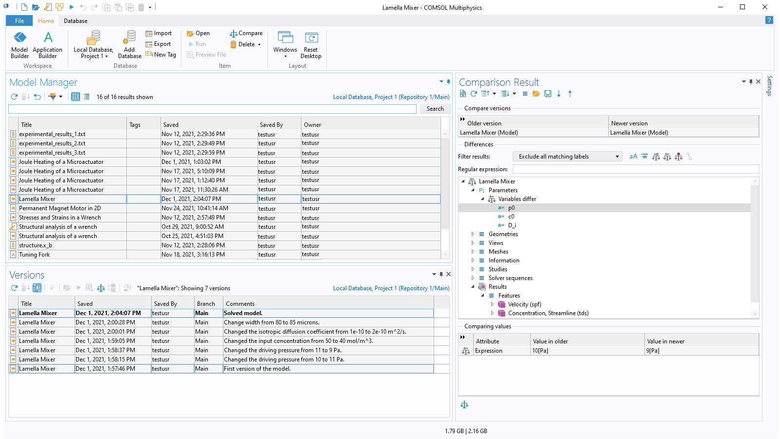 COMSOL Multiphysics® 소프트웨어에는 실험 데이터 및 CAD 파일과 같은 모델 및 관련 파일의 효율적인 데이터베이스 저장 및 버전 제어를 위한 도구인 Model Manager가 포함되어 있습니다. Model Manager는 COMSOL Multiphysics® 사용자 인터페이스에 완벽하게 통합되어 있습니다. 모델 내의 기능 검색 및 두 모델 버전 간의 정확한 차이를 표시하는 비교 기능을 포함하는 구성 및 고급 검색 기능을 제공합니다. 모델 파일은 불필요한 중복을 최소화하여 시스템에 효율적으로 저장됩니다.